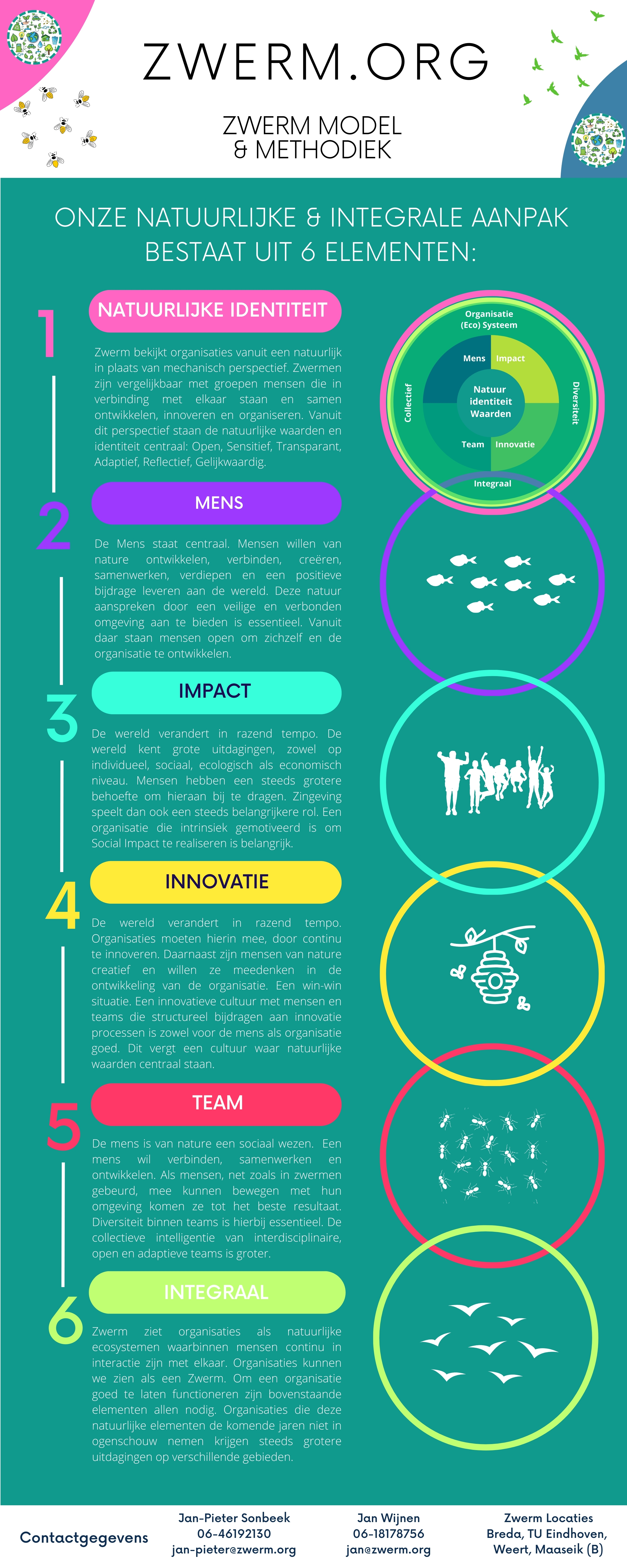 Om je organisatie meer als een natuurlijk systeem te ontwikkelen, innoveren en organiseren, heeft Zwerm.Org een integrale methodiek ontwikkeld. Hierbij wordt er vanuit verschillende invalshoeken naar ontwikkeling van mensen en organisaties gekeken.