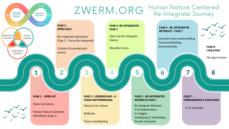 Zwerm gaat naast het reguliere Recruitment & Re-integratie proces op een verdiepend niveau met verzuim en verloop aan de slag om zo Recruitment en Re-integratie meer onderdeel te laten zijn van een natuurlijke manier van werken. Hierbij kunnen we op verschillende manieren met elkaar aan de slag gaan. De totale Journey kan bestaan uit een Scan, Games, Hackathons, Retreats en Experiences. Afhankelijk van vraag en het probleem van de organisatie richten we de journey in.